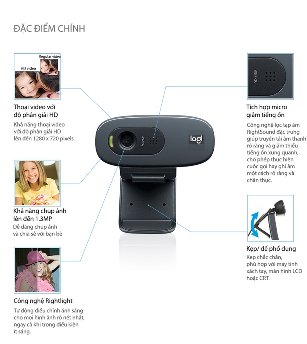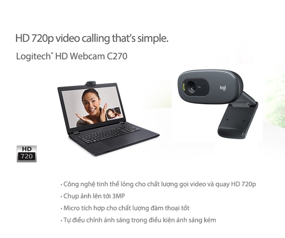 Webcam Logitech C270 720p HD - Góc cam 55 độ, micro giảm ồn, tự động chỉnh sáng cho Video Call, chụp ảnh 3MB, phù hợp PC/ Laptop